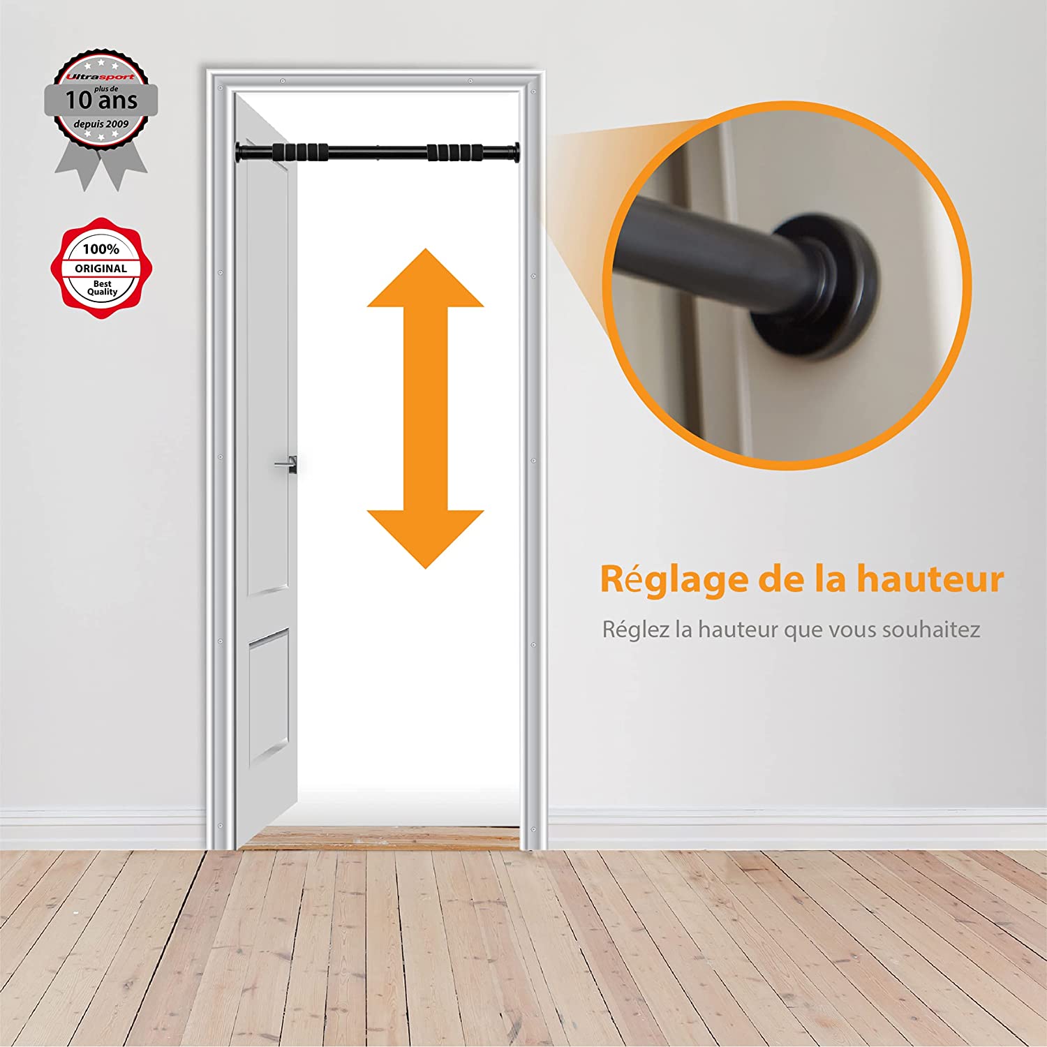 Barre de traction à 2 poignées réglable en largeur, Elle peut être fixée au cadre de porte sans faire de trou pour un entraînement ponctuel, Pour une utilisation à plus long terme, des vis et le matériel nécessaire au montage sont fournis