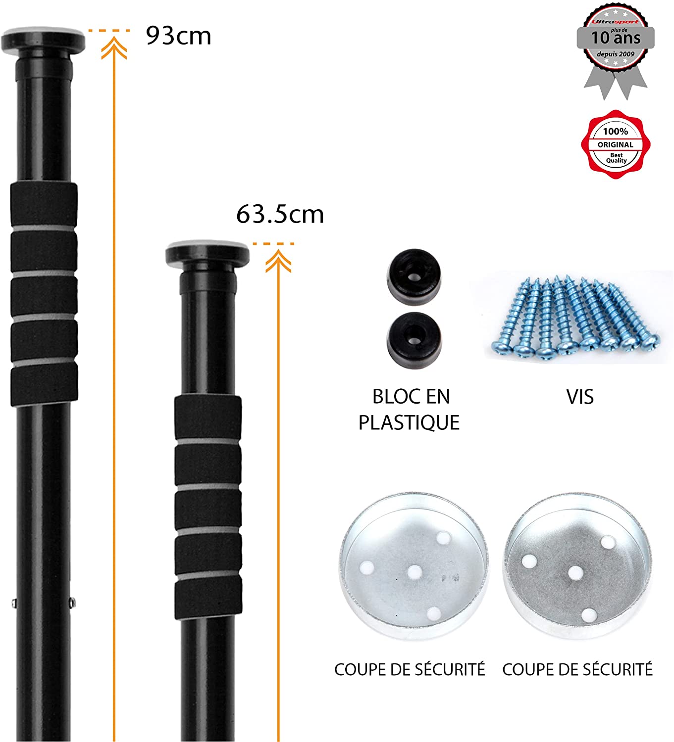 Acier stable et utilisation facile grâce au système télescopique / Diamètre de la barre : env 28 mm, longueur : 63 à 93 cm, réglable pour une bonne tenue sur le cardre de porte